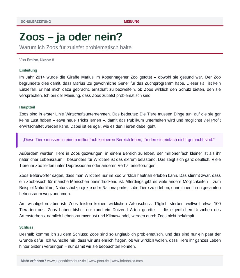 Schülerzeitung: Zoos – ja oder nein? Eine Meinung